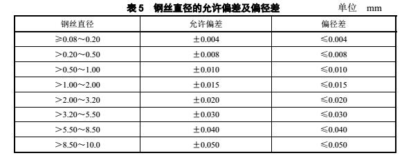 鋼絲直徑按 8.6 條進行測定,其允許偏差及偏徑差(2)見表 5。