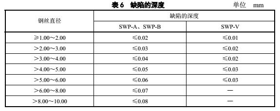 直徑 1.00mm 以上鋼絲的缺陷按 8.7 條進行檢驗,缺陷的深度見表 6。